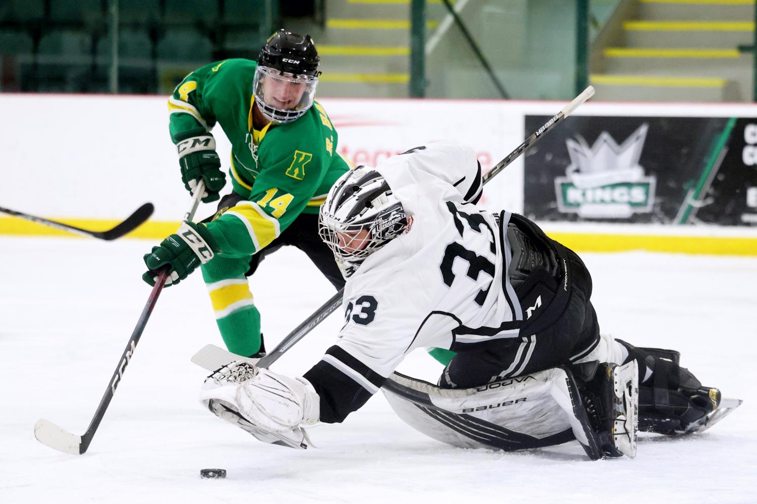 SHERWOOD PARK, AB - October 31: Leduc Riggers goaltender Dayton McGrath #35 lunges over the puck in front of Sherwood Park Knights forward Ryan Bablitz during Capital Junior Hockey League action at Randy Rosen Arena in Sherwood Park, AB on October 31st, 2023. (Photo by James Maclennan)