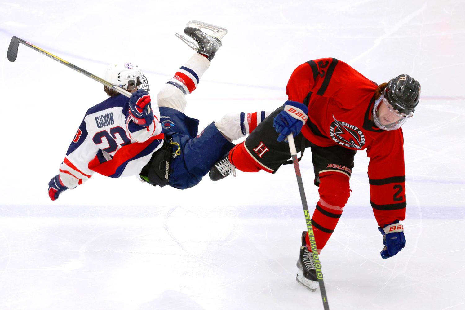 FORT SASKATCHEWAN, AB - February 4: Wetaskiwin Icemen forward Josh Gagnon #23 collides with Chase Boettger #22 of the Fort Saskatchewan Hawks during Capital Junior Hockey League play at the Dow Centennial Centre in Fort Saskatchewan, AB on February 4th, 2024. (Photo by James Maclennan)