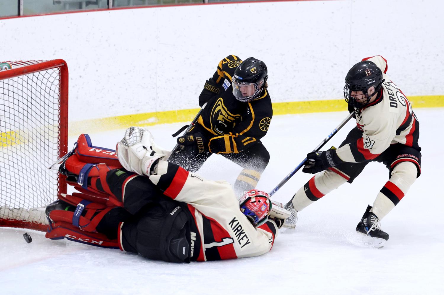 STRATHCONA COUNTY, AB - February 20: Strathcona Bruins forward Jake Ball #17 shoots the puck past Fort Saskatchewan Hawks goaltender Lachlan Kirkey #1 during Capital Junior Hockey League action at at the Strathcona Olympiette Centre in Strathcona County, AB on February 20th, 2024. (Photo by James Maclennan)