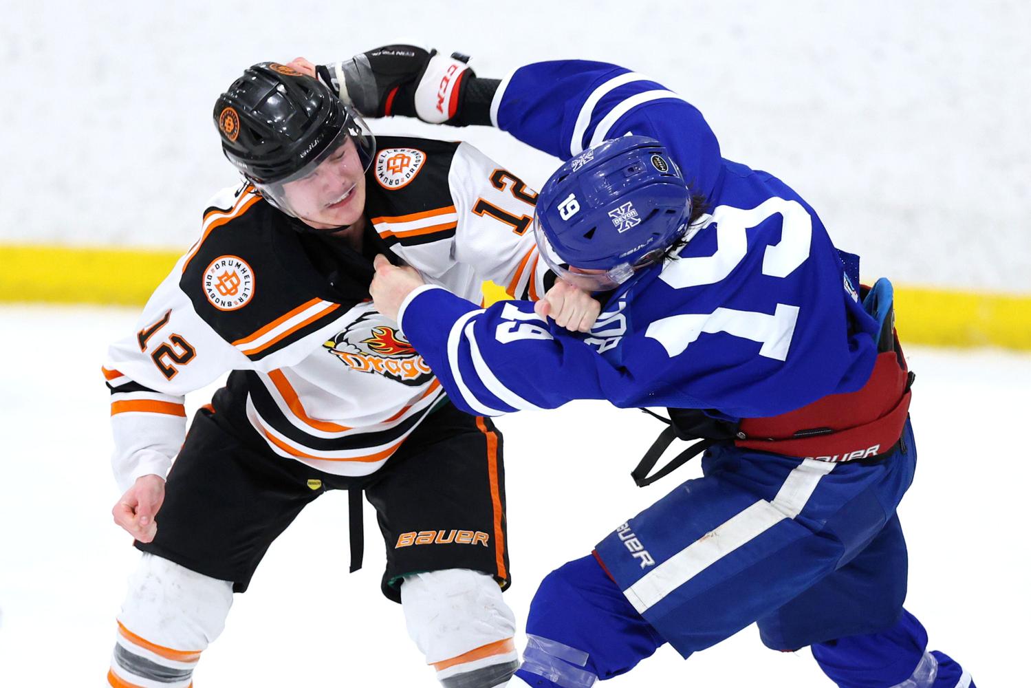 DEVON, AB - February 1: Devon Xtreme forward Harrison Boldt #19 trades punches with Tristan Serrao #12 of the Drumheller Dragons during Alberta Junior Hockey League play at GFL Twin Arena in, Devon AB on February 2nd, 2025. (Photo by James Maclennan)