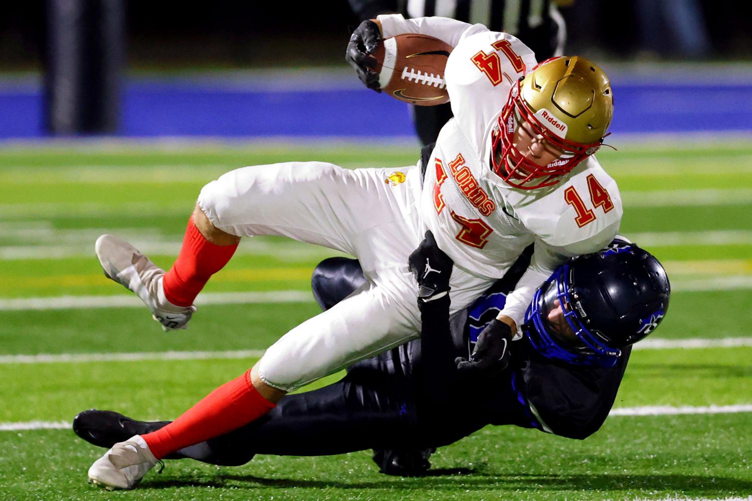 BEAUMONT, AB - October 3: Graydon Gilewich of the Strathcona Lords is hauled down by Beaumont Bandits linebacker Lorenzo Monus during regular season action at Beaumont Composite Highschool on October 3rd, 2024. (Photo by James Maclennan)