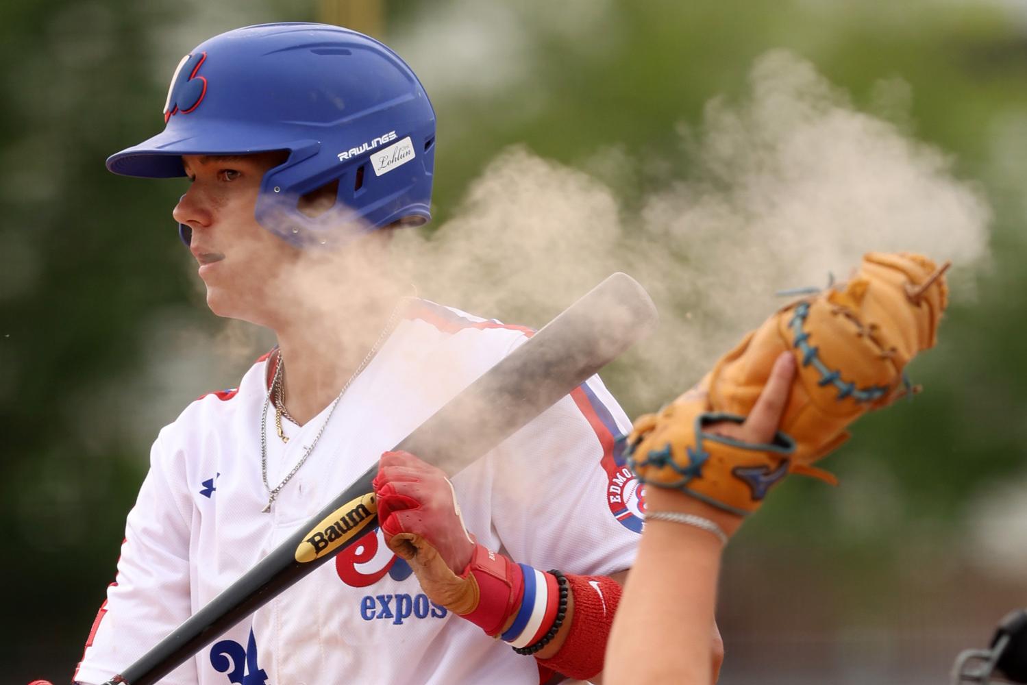 EDMONTON, AB - July 13: Cooper Buchko of the Edmonton Expos takes a pitch during a bunt attempt against the Leduc Black Gold 47’s at John Fry Sports Park in Edmonton on July 13th, 2024. (Photo by James Maclennan)