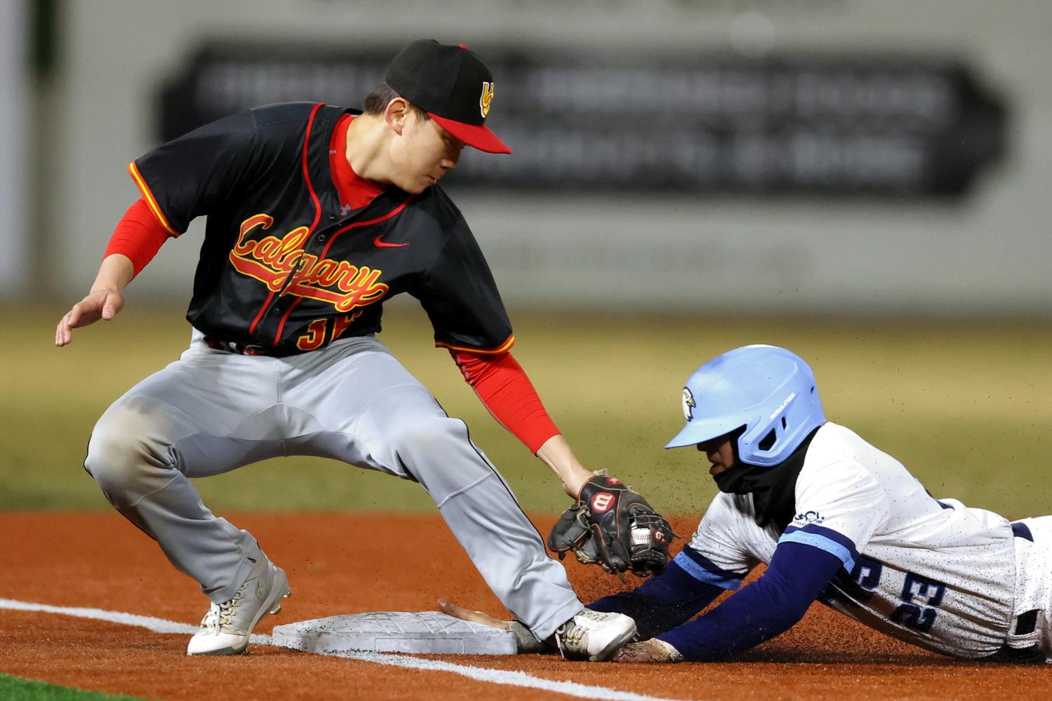 EDMONTON, AB - April 7: University of Calgary Dinos third baseman Brendan Tong attempts a tag on Edmonton Collegiate Hawks baserunner Brayden Morris during Canadian Conference Baseball Conference action at RE/MAX Field on April 7th, 2025. (Photo by James Maclennan)