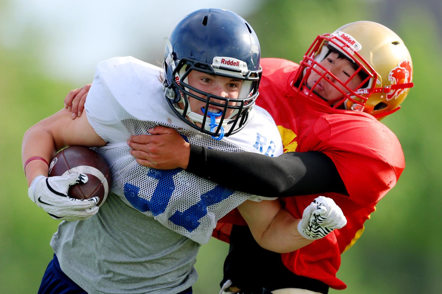 BEAUMONT, AB - June 5: Beaumont Bandits running back Jhett Manning fends off an opponent from the Scona Lords during the 2025 Spring Jamboree at Beaumont Composite Highschool on June 5th, 2025. (Photo by James Maclennan)