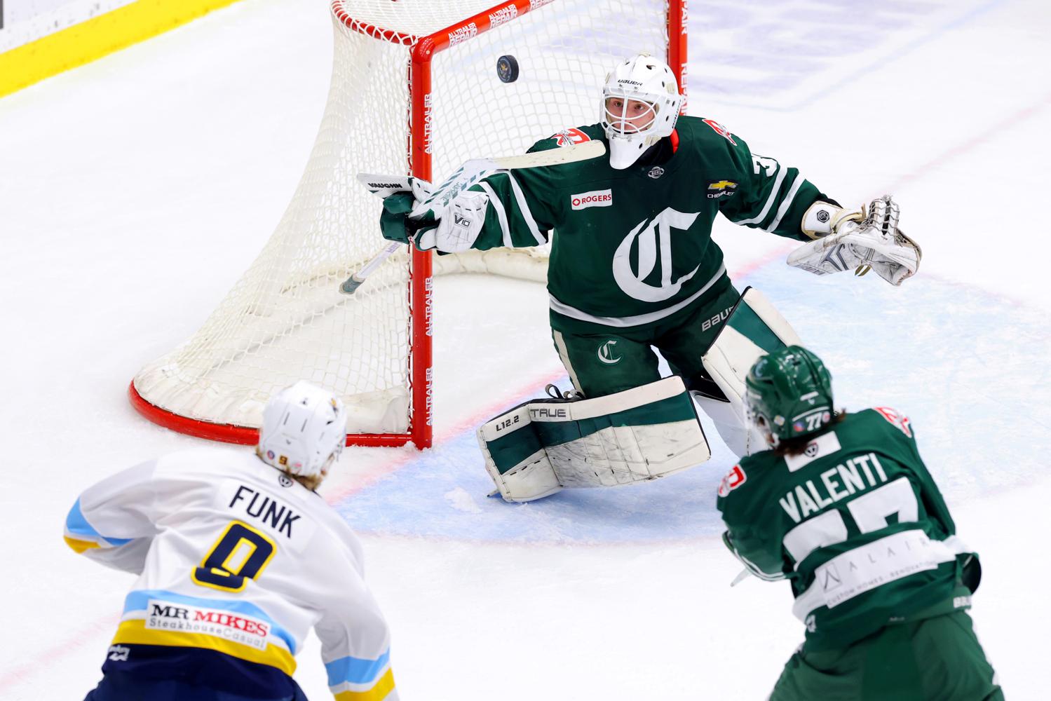 SPRUCE GROVE, AB - November 1: Sherwood Park Crusaders goaltender Jack Scali #30 deflects a shot during Alberta Junior Hockey League play against the Spruce Grove Saints at Thompson Family Arena in Spruce Grove, AB on November 1st, 2025. (Photo by James Maclennan)