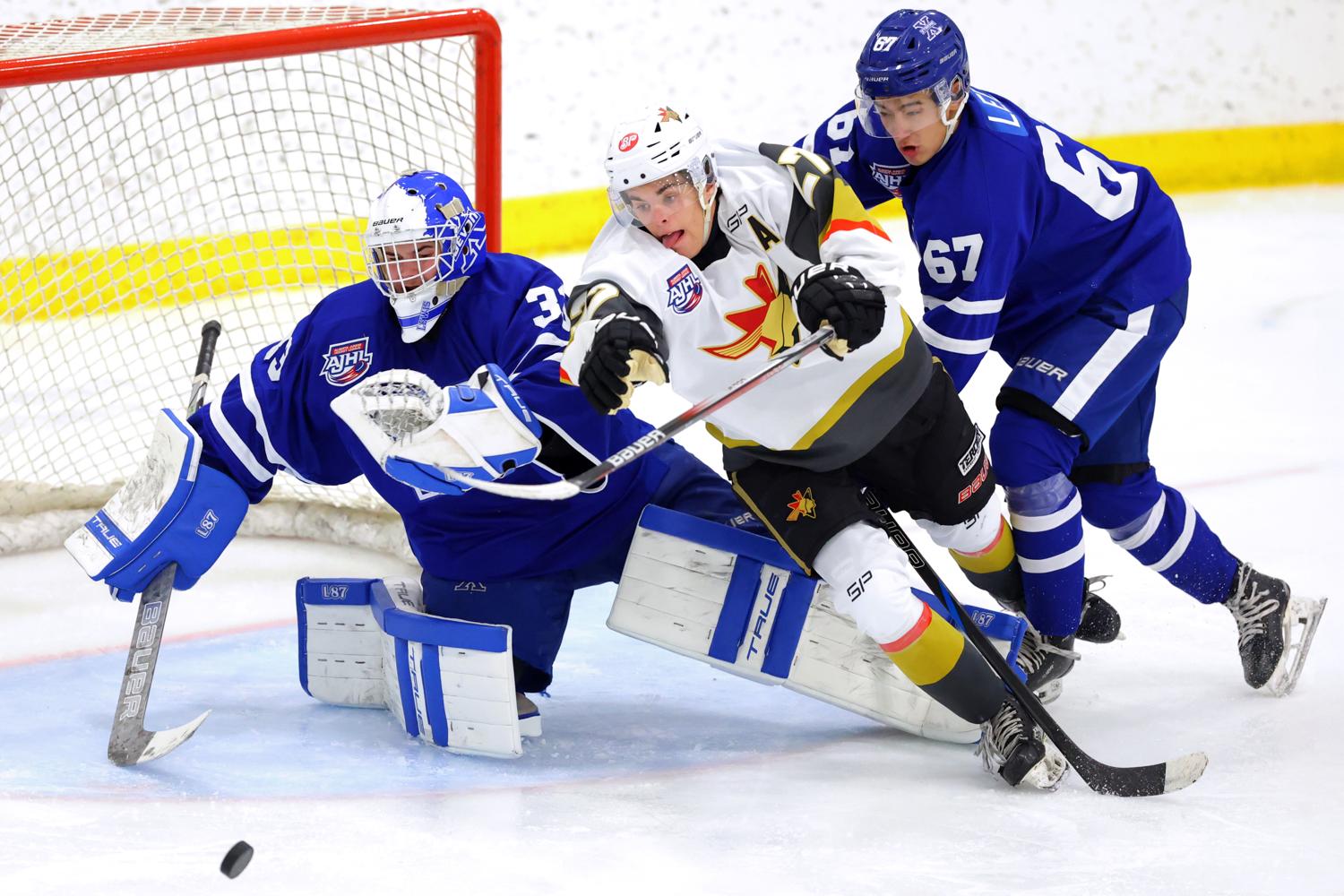 DEVON, AB - February 4: Bonnyville Pontiacs forward Christophe Lussier #27 collides with Devon Xtreme Goaltender Preston Lewis and Ashton Lee #67 during Alberta Junior Hockey League play at GFL Twin Arena in Devon, AB on September 20th, 2025. (Photo by James Maclennan)