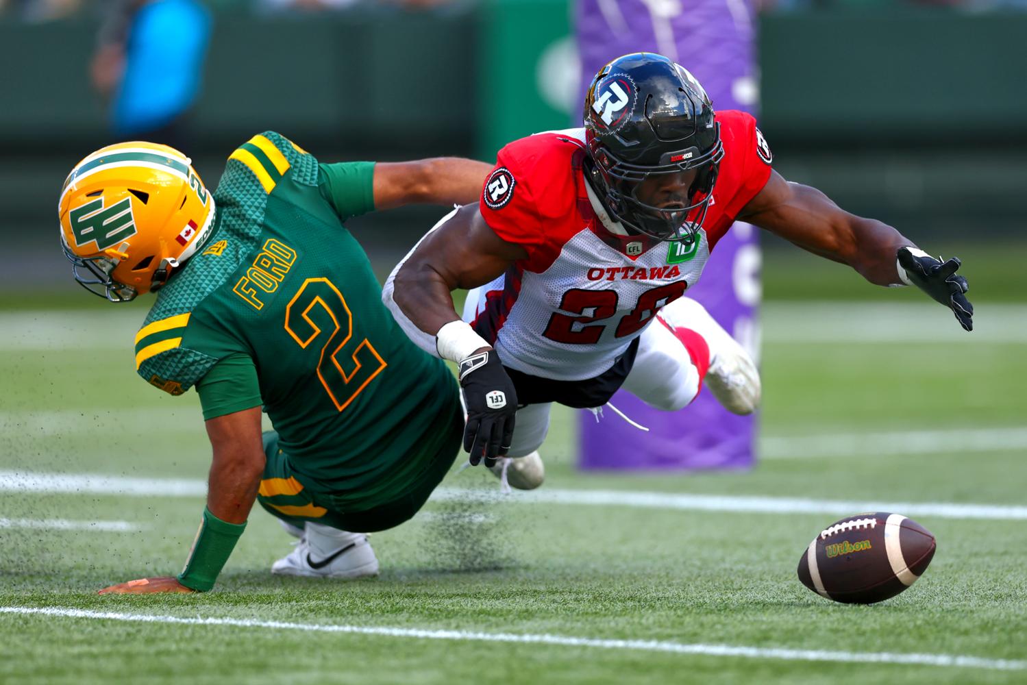 EDMONTON, AB - July 6: Ottawa Redblacks linebacker Frankie Griffin dives for the ball after knocking it loose from Edmonton Elks quarterback Trey Ford during CFL play at Commonwealth Stadium on July 6th, 2025. (Photo by James Maclennan)