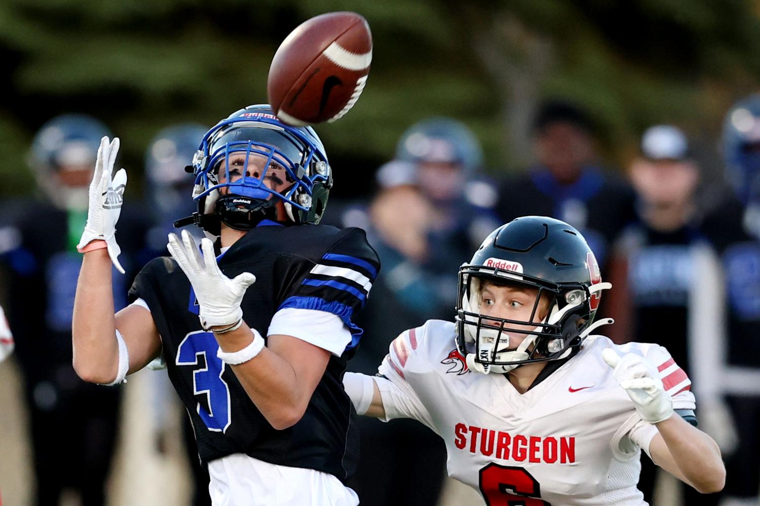 BEAUMONT, AB - October 10: Beaumont Bandits reciever Corbin Carwell makes a catch during a game against the Sturgeon Spirits during a game at Beaumont Composite Highschool on October 10th, 2024. (Photo by James Maclennan)