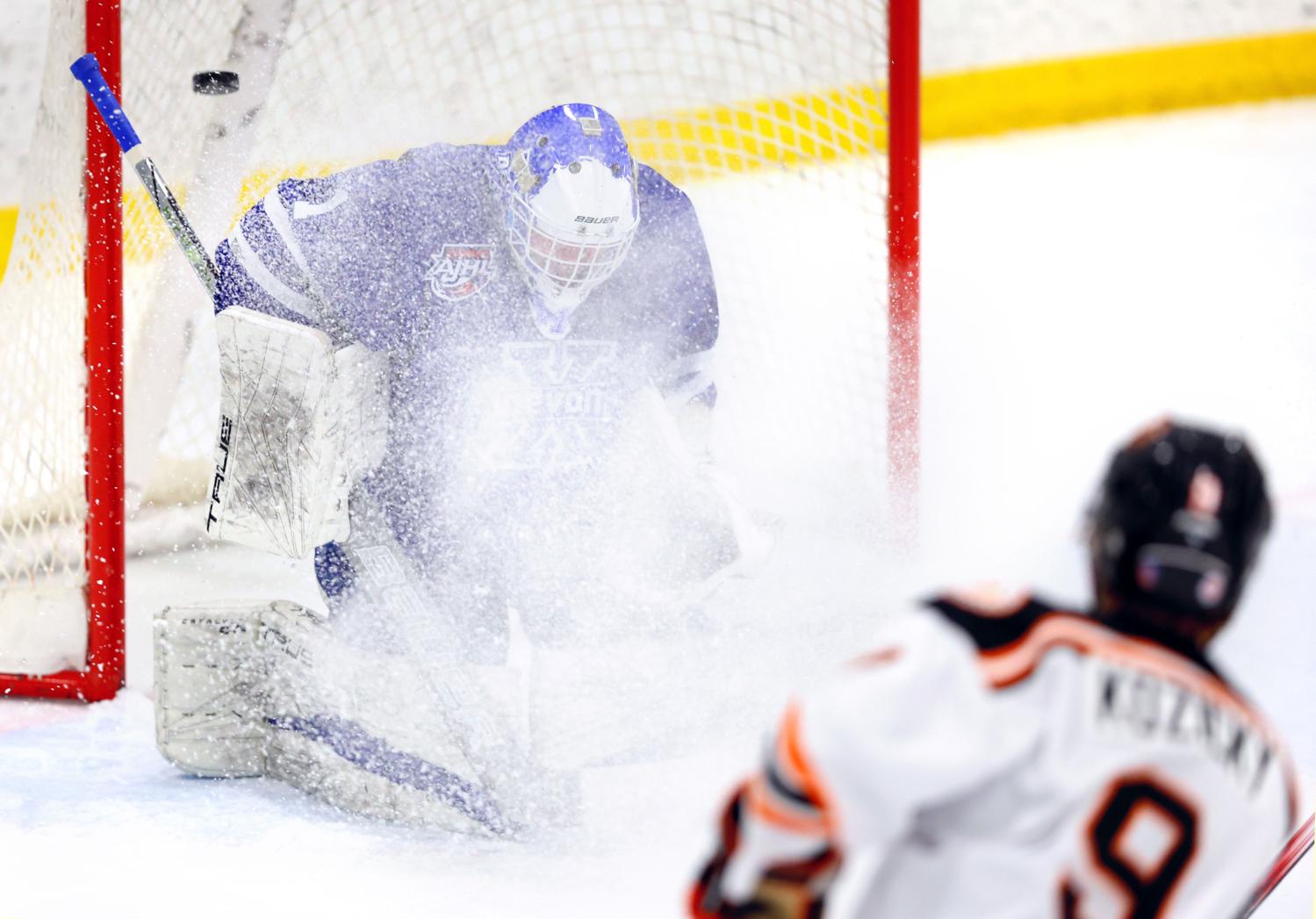 Devon Xtreme goaltender Preston Lewis is blasted with snow while attempting to stop a shot from Drumheller Dragons forward Lauchlan Kozicky during Alberta Junior Hockey League action at GFL Twin Arena in Devon, AB, on Feb. 1st, 2025. (Photo by James Maclennan)
