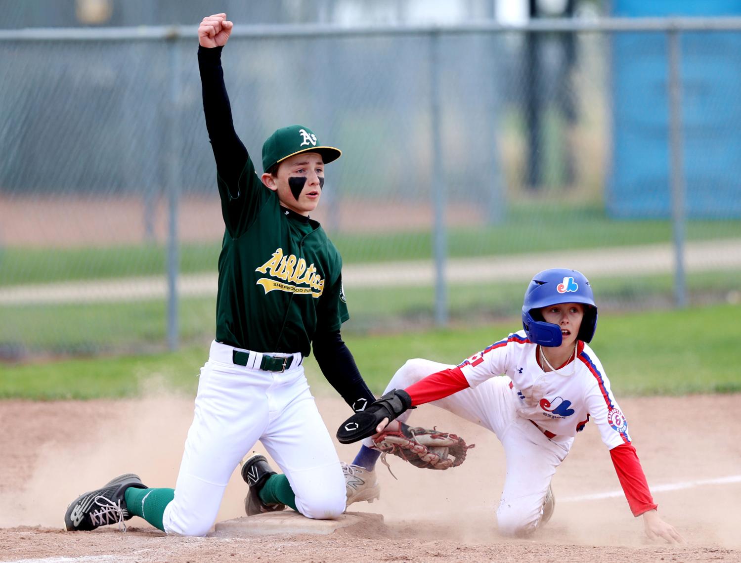 SPRUCE GROVE, AB - May 18: 13U AAA Sherwood Park Athletics 3rd baseman Caleb Poulin reacts after tagging an opponent Henry Singer Ball Park in Spruce Grove, AB on May 22nd, 2024. (Photo by James Maclennan)
