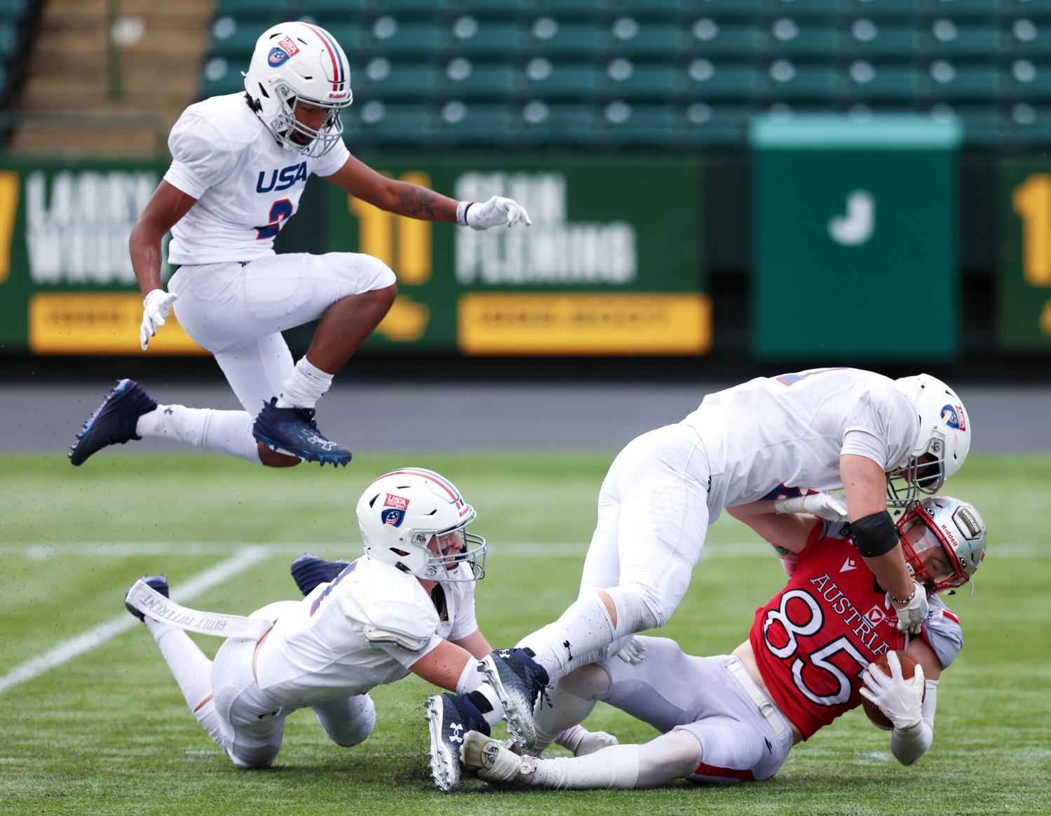 EDMONTON, AB - June 30: Team Austria's Jonas Jan Dachs-Wiesinger #85 is tackled by members of Team USA during IFAF U20 World Junior Football Championship gameplay at Commonwealth Stadium in Edmonton, AB, Canada on June 30rd, 2024. (Photo by James Maclennan)